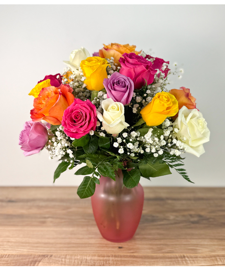 2 dozen of our medium stem roses are professionally arranged in a valentine's colored glass vase and accented with small flowers. A Jimmy's original!