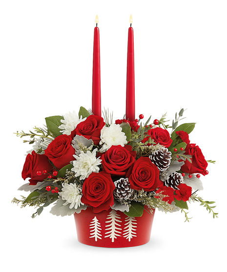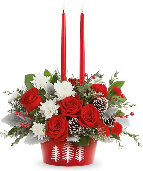 Celebrate the season with Teleflora's Snowy Pines Centerpiece. Bursting with red roses and white blooms in Teleflora's Snowy Pines Dish, this festive design brings winter magic to Christmas tables and holiday gatherings.