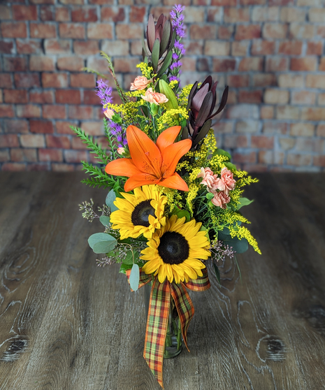Celebrate the vibrant beauty of autumn with this tall, cheerful bouquet! Featuring golden sunflowers, bold orange lilies, and touches of purple liatris, this design is full of seasonal charm. Accented with fresh greenery, golden solidago, and finished with a festive fall ribbon, it’s the perfect mix of rustic elegance and fall color.