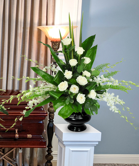 Elegant white roses are accented with white dendrobium orchids and a variety of lush greenery and professionally designed in a plastic black urn. Deluxe version adds more flowers for a fuller look.