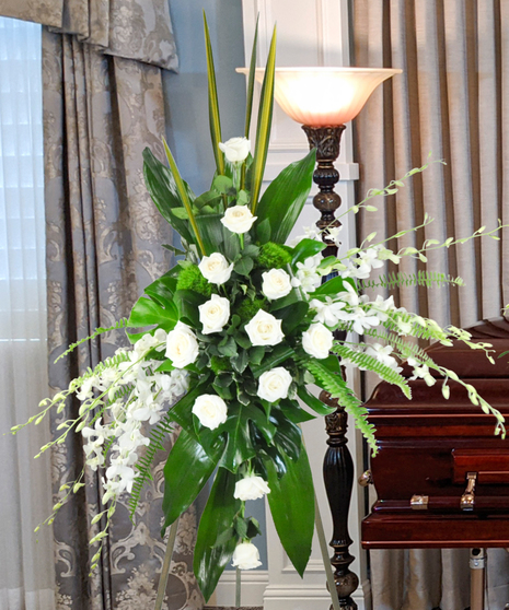 Elegant white roses are accented with white dendrobium orchids and a variety of lush greenery. Deluxe version includes more of the same flowers for a fuller display.