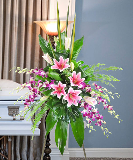 Elegant and fragrant pink oriental lilies are accented with purple dendrobium orchids and a variety of lush greenery.