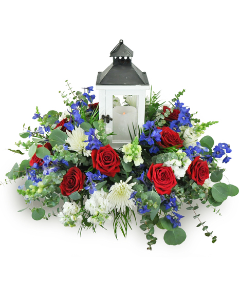 A wooden lantern with glass panes sits on a bed of beautiful roses, delphinium, mums and more. Includes a battery powered candle. The lantern may be white or brown.