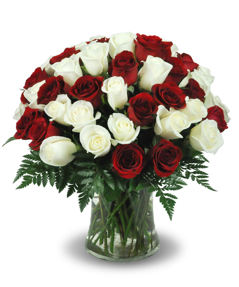 48 assorted medium stem roses arranged in a clear glass vase and accented with lush greenery. An impressive display of roses!
