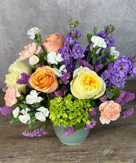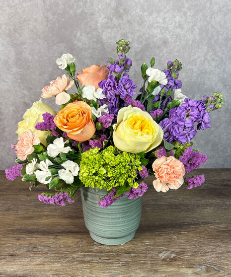 Bright, cheerful, and full of personality, this arrangement brings together a vibrant mix of sunny yellow and peach roses, soft lavender blooms, and textured accents for a fresh, uplifting look. Featuring premium roses, delicate stock, and pops of statice, the design blends warm and cool tones for a playful yet balanced feel. Lush greenery adds natural movement, while the compact presentation keeps it polished and easy to display.