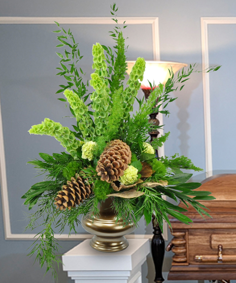 Beautiful sugar pine cones from Washington are nestled in a mix of lush greenery and accented with dried mushroom sponges and small green hydrangeas.